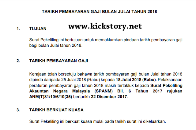 Menurut surat pekeliling yang dikeluarkan hari ini (26 Jun 2018) oleh Akauntan Negara, Datuk Saat Esa, kerajaan telah bersetuju bahawa tarikh pembayaran gaji bulan Julai 2018 dipinda.